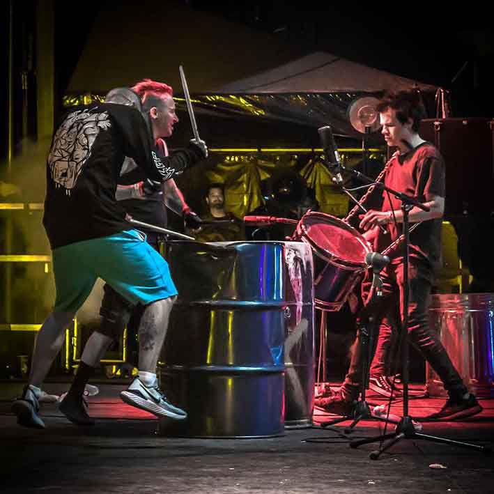 Our percussionists can be booked in varying line-ups from duos to bigger, stage-filling set-ups. Their high energy sets will delight guests