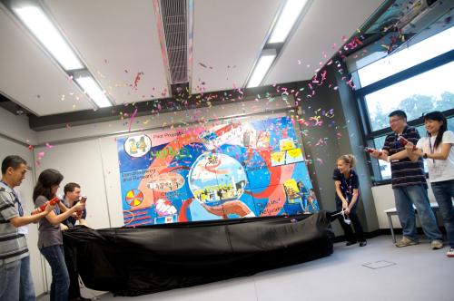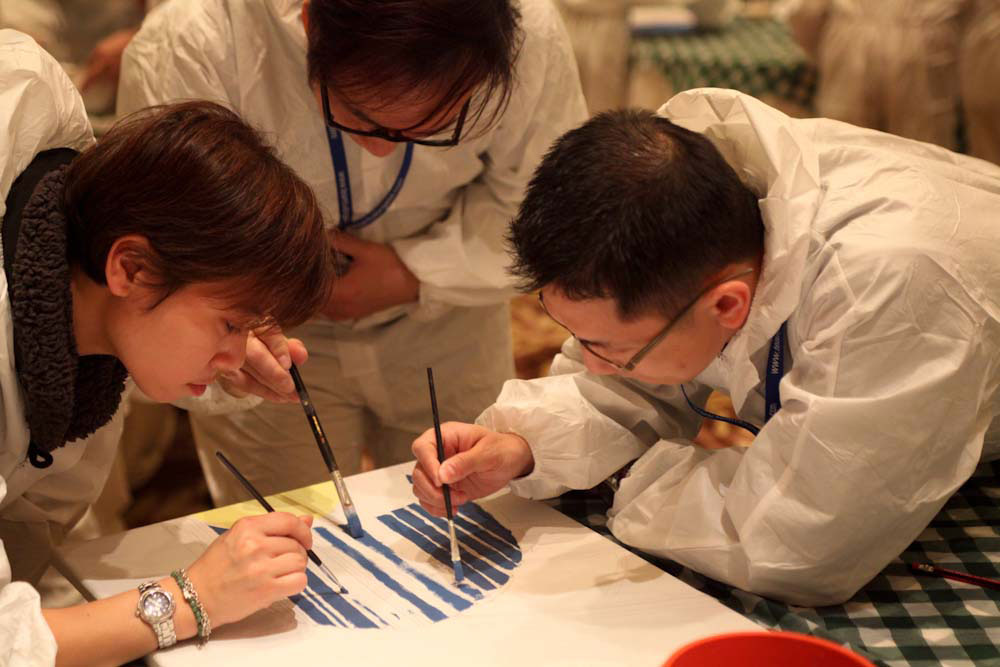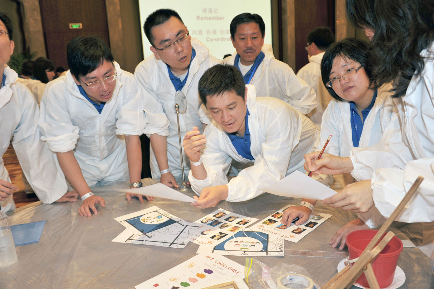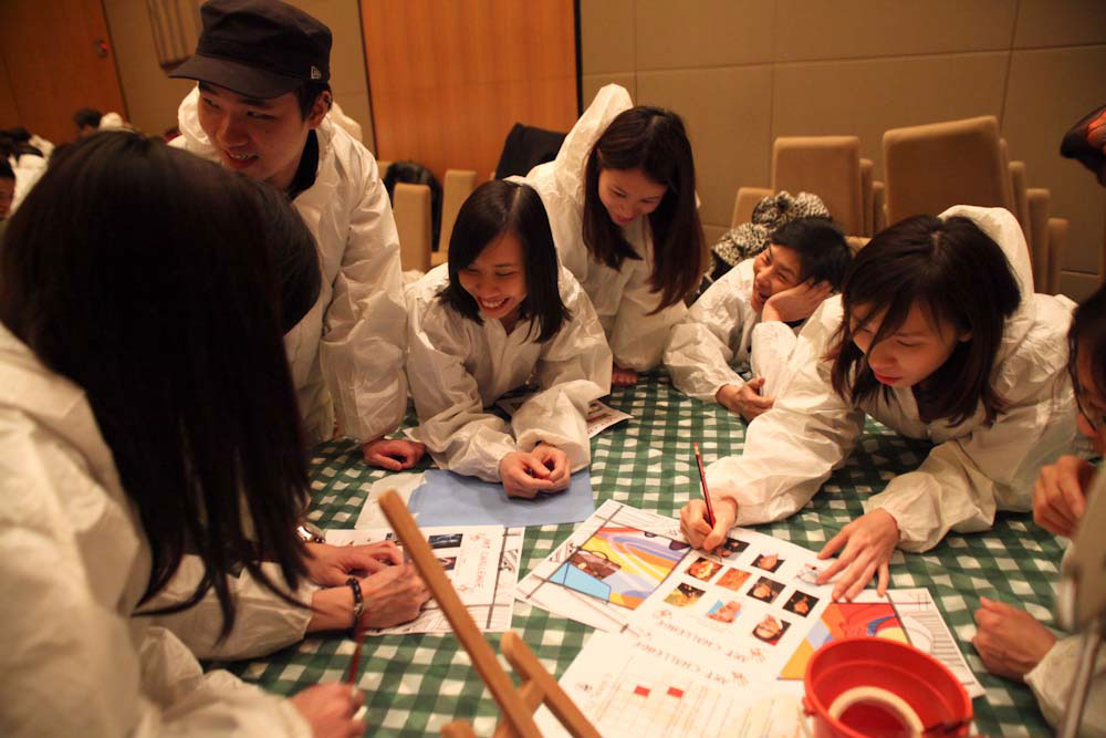 The delegates are divided into small teams, each responsible for printing one or more individual canvases which will be brought together at the end to create a large image. Armed with all the artistic equipment they will need, the deviates much work well within their own teams as well as communicating with other teams to ensure that colours and lines match up when the image are put together, and that the final image is a success. Through this activity, delegates soon realise that co-operation with other teams is essential.