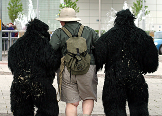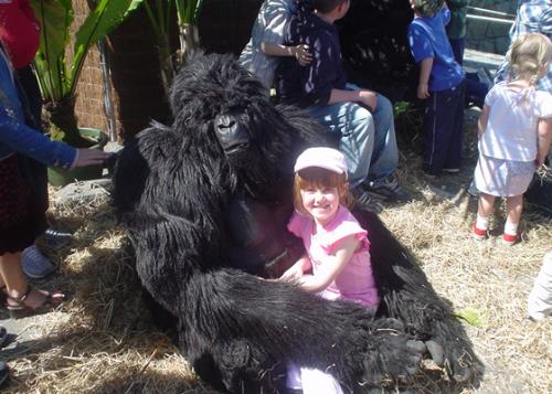 Four realistic walk-around Gorillas accompanied by their Explorer friend