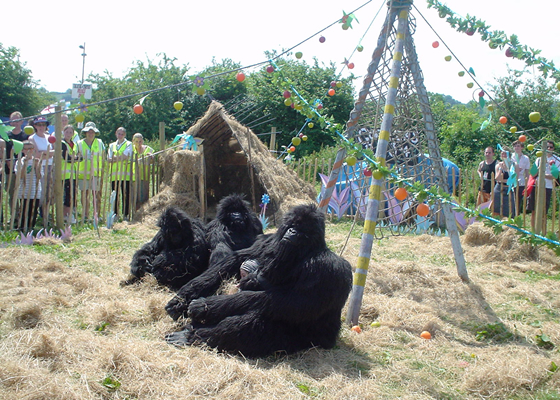 A family of four realistic Mountain Gorillas accompanied by their Explorer friend. This act is incredibly popular with everyone. As well as being fun and visually stunning, it has a strong message concerning the threat currently facing Mountain Gorillas and deals directly with the fact that there are only 700 Mountain Gorillas left in the whole world. The Explorer, although played with comedy, informs the audience on how they can have a direct impact on saving the Mountain Gorillas from extinction and as a consequence, help reduce global warming.