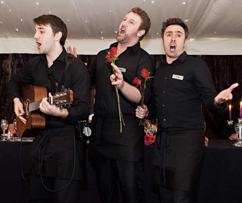 The surprise singing waiters avoid formal opera and backing tracks; preferring to offer unique performances of popular music played live with an acoustic guitar, making them a highly versatile surprise act suitable for many venues and ensuring each performance has a personal touch. Able to perform unamplified they also have the ability to roam from table to table, providing mix and mingle entertainment rather than a focussed show if required.