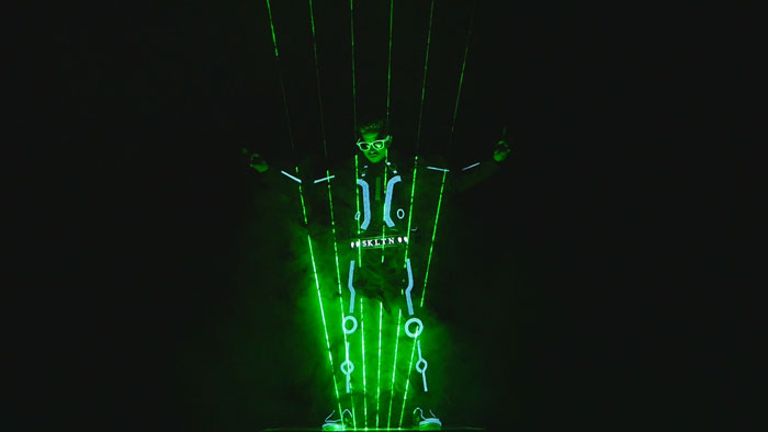 Wearing an LED lit full body suit, our Laser Artist manipulates multiple lasers with his hands. Creating unbelievable light effects, our talented Laser performer also works alongside an atmospheric soundtrack, creating dramatic laser entertainment in time with music. One of the most exciting cutting edge technology acts, our laser dancer uses different coloured lasers and can adapt his choreography to suit your specific event requirements.