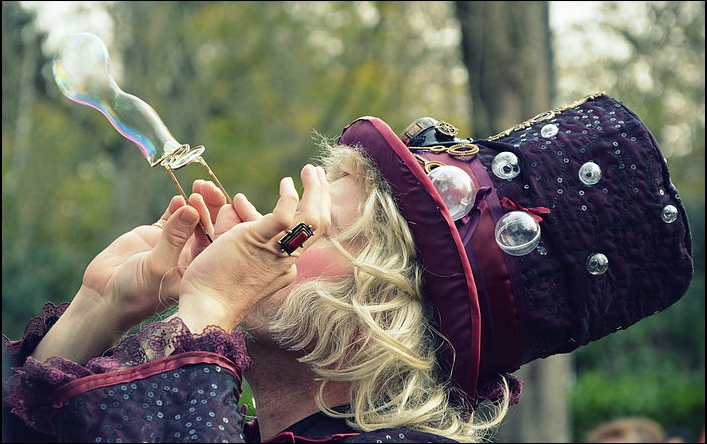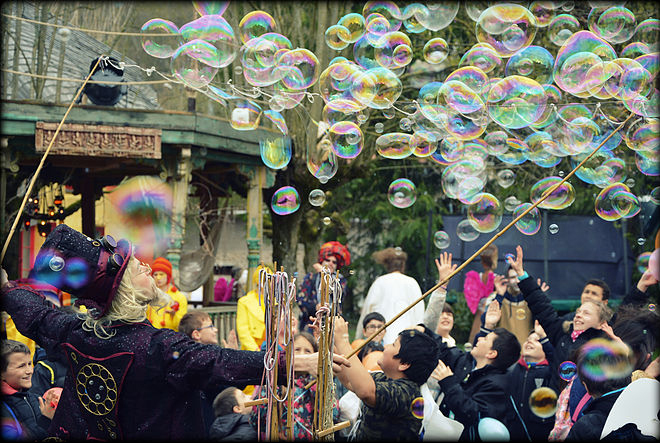 Dressed in an extravagant manner, this Themed Bubble Magician’s outfit is one of the things that strikes audiences most and that makes his performance unique and different. His big purple hat, steampunk goggles and long white hair and beard recalls the looks of an old wizard or a 19th century entertainer.