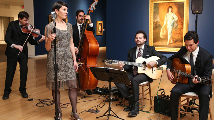 Book jazz musicians, big bands and swing orchestras from Scarlett Entertainment New York to perform at your event in the USA or worldwide. Our Brooklyn based swing band, Traditional Swing Band Brooklyn are known for their creative and stylish performances. Featuring a talented female vocalist, guitarist, violinist, bassist, our event musicians have performed in a wide variety of high profile venues including New York’s Museum of Art and Tribeca Film Festival.