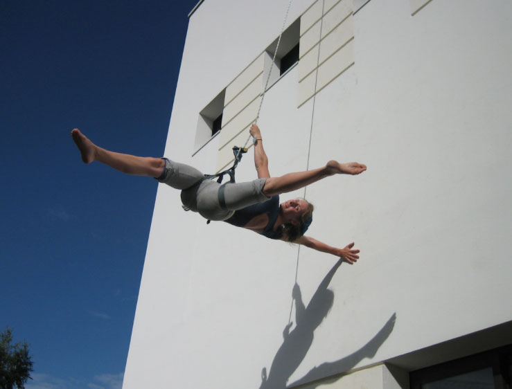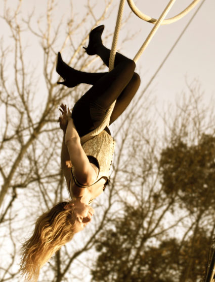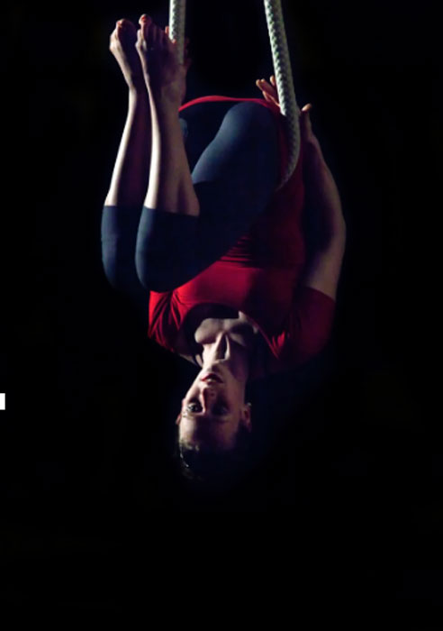 "Vertical Dance" - An adaptable act, the aerialist performs against a wall, demonstrating somersaults and flips.