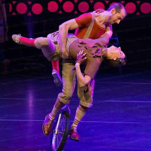 Both of our circus performers began training in the circus arts from a very early age and are professionally trained and hugely experienced in a range of disciplines including duo straps and aerial silks, as well as their trademark unicycle acrobatic show.