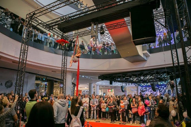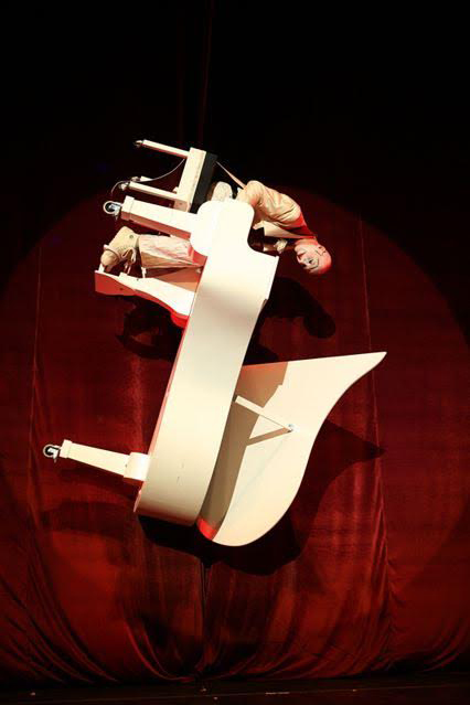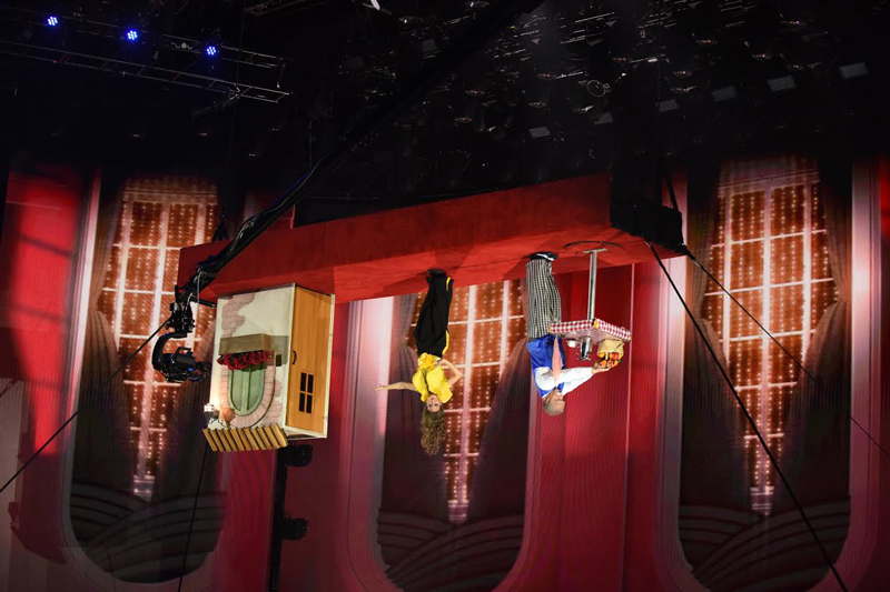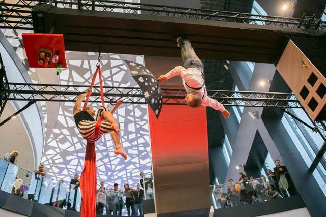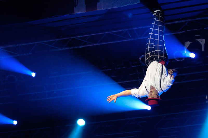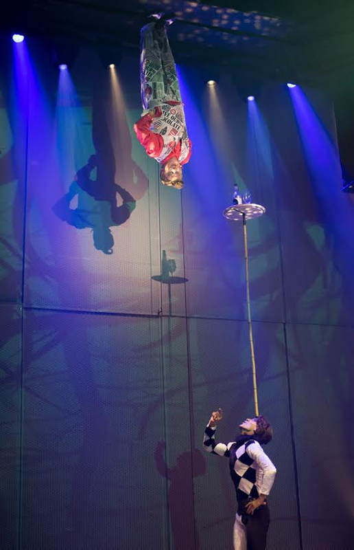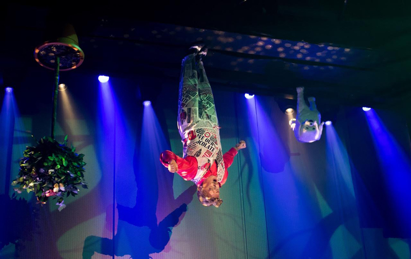 Skilled circus artists perform various routines whilst hung upside down from the ceiling: they dance, they juggle, they play tennis...