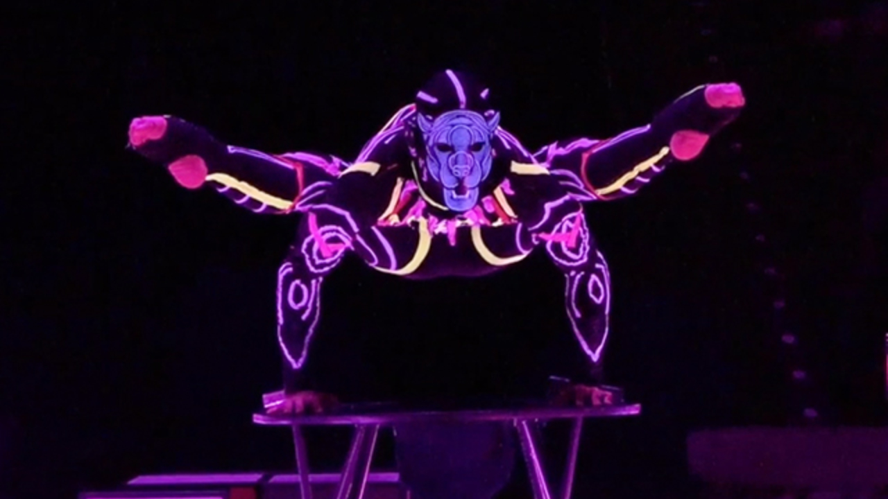 Contortionist dressed in a UV outfit and wearing a feline mask captivates with his unique display of flawless technique and boundless creativity