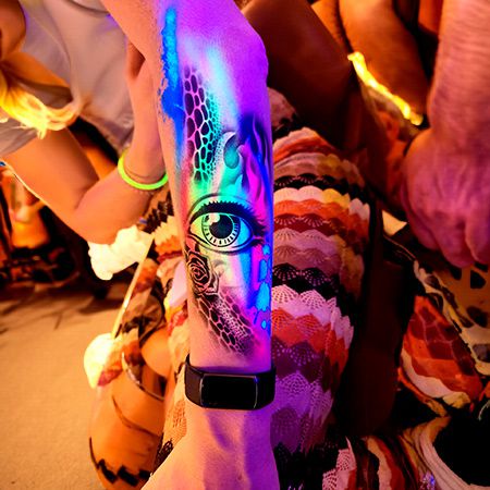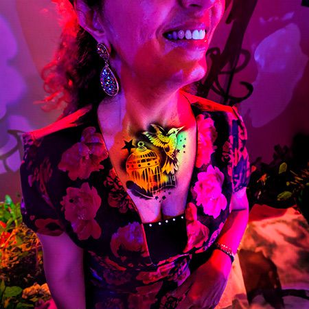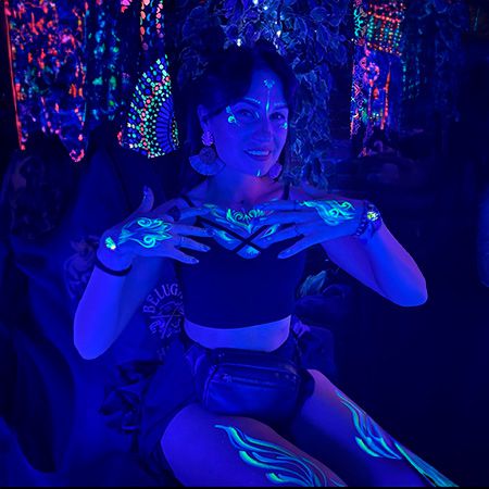 As a skilled UV tattoo and face paint artist, she adorns guests' faces and bodies with mesmerizing designs, turning them into living works of art