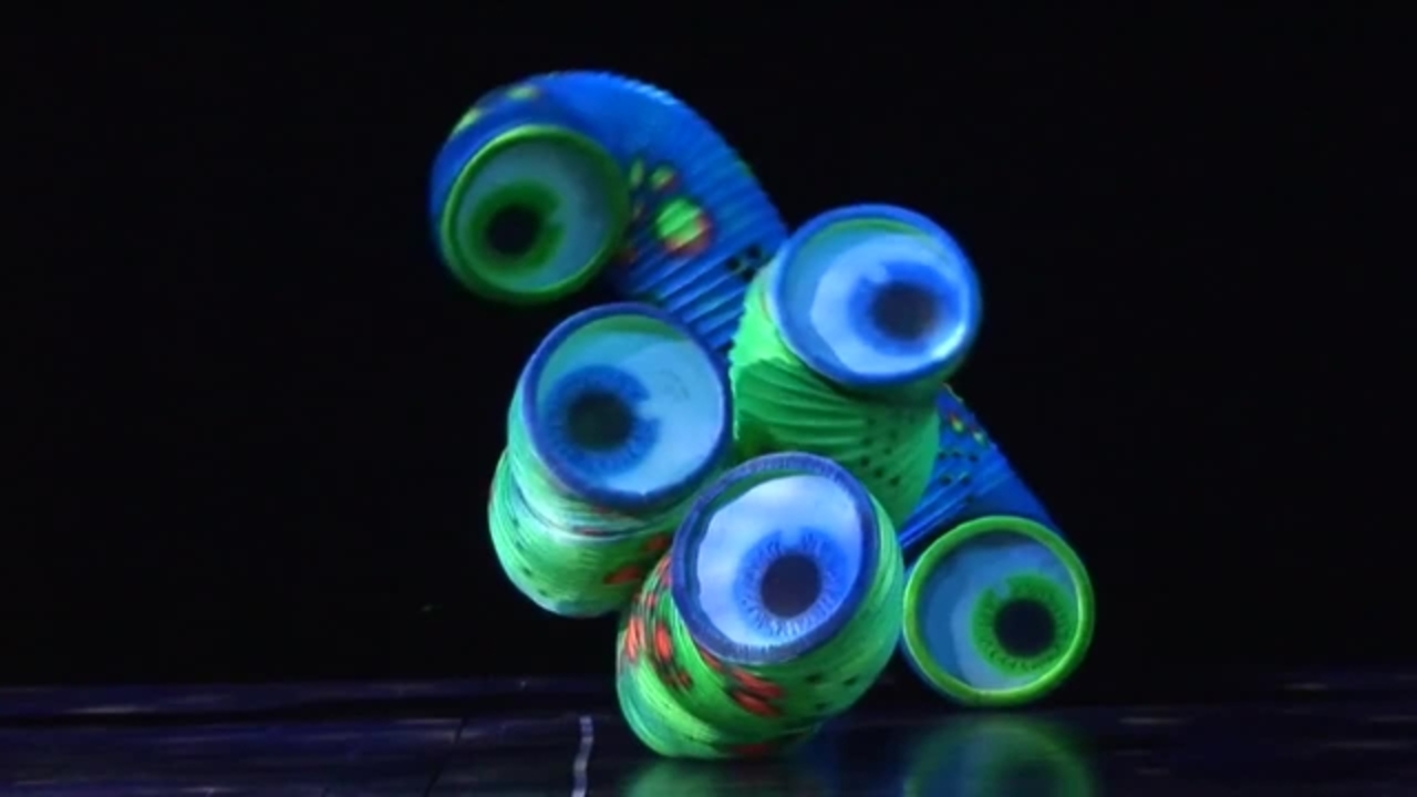 This incredible slinky dance has also appeared at theme parks and circuses as well as at special events for Warner Brothers, Comedy Central and Disney. This fun filled and lively act will amaze adults and children alike with its unique and dazzling choreography as the giant slinkies twist and spin about, looking like mysterious underwater denizens or aliens for outer space with their giant eyes and many limbed bodies.
