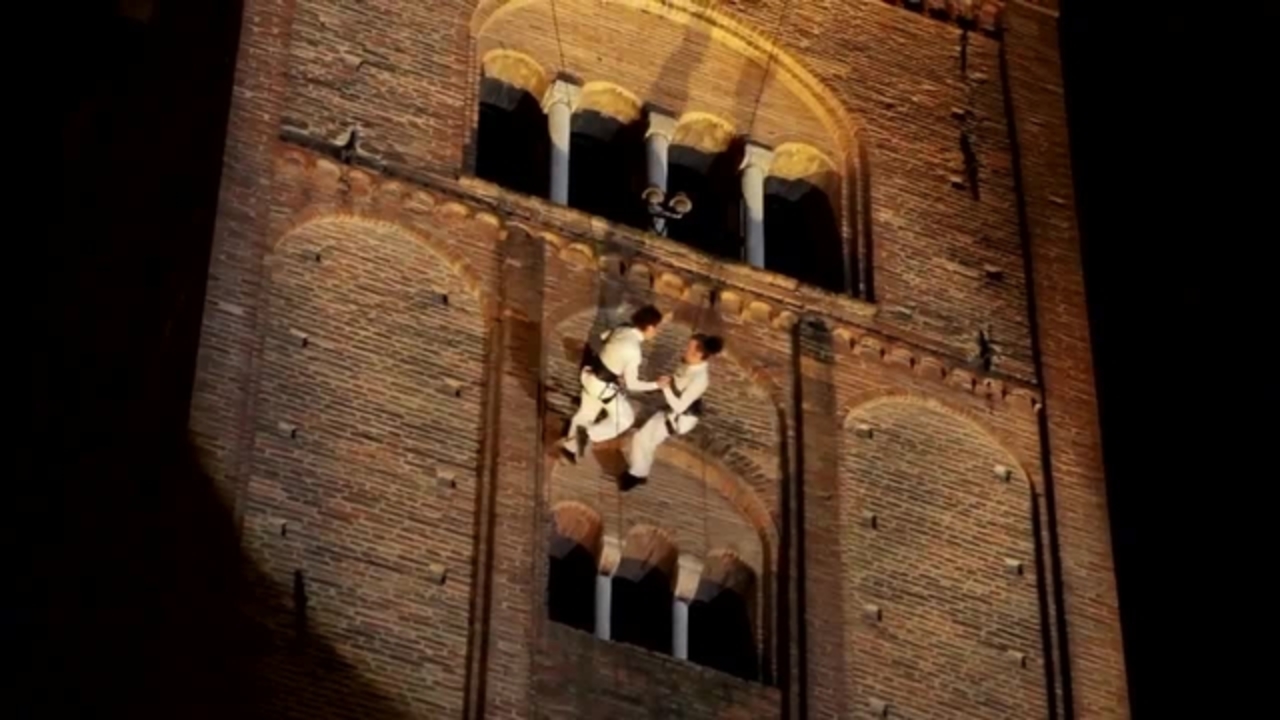 Drama, video sets and physical elements combine in a visual comedy show where 2D projections are combined with 3D acrobats and actors, producing a truly unique effect. As they are drawn into a world of comics and animated film, the two protagonists go on an adventurous trip balanced between the fictitious nature of the drawings and the pseudo-reality of a pc that projects the images.