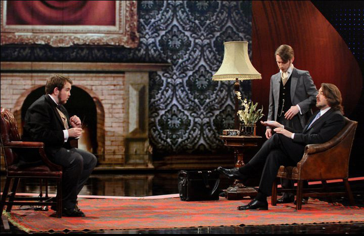 The duo offer a full stage show with grand, imperial set dressing which creates the drawing room of a Victorian house. This hour-long extravaganza sees them engage volunteers with all manner of humorous tricks which utilise their unique gift of time travel. A smaller version of the same, hour-long show is available for smaller venues or more modest budgets.