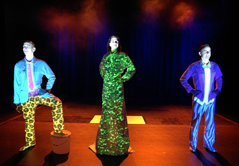 Expertly using video projection, our three artists seem to gulp down coloured paints, using a giant straw to transfer the liquid between their bodies. Reality becomes warped as minds spin, faces appear on the back of heads, and crazy costume changes are made at the snap of a finger before your very eyes.