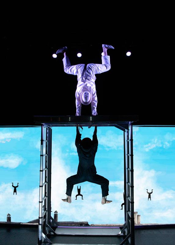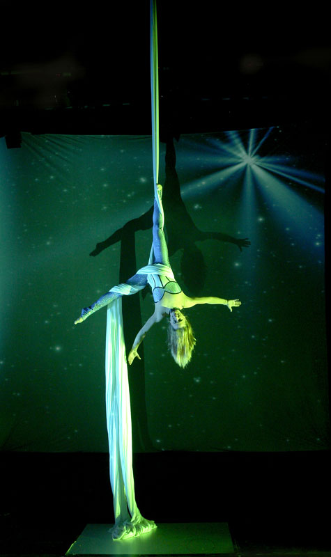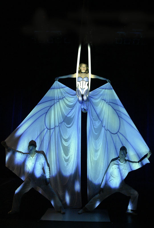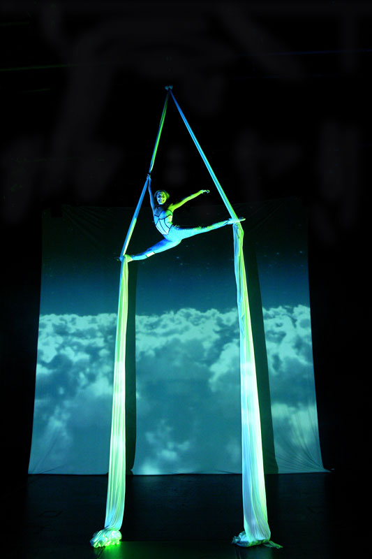 With a huge range of special effects using video projection, our artists’ acrobatics are transformed into astounding colourful and moving imagery. Performing incredible feats of strength and poise, our hand balance acrobatics performers create beautiful shapes, while our silks artist performs gravity-defying choreography high above the heads of the audience. All overlaid with striking video projection.