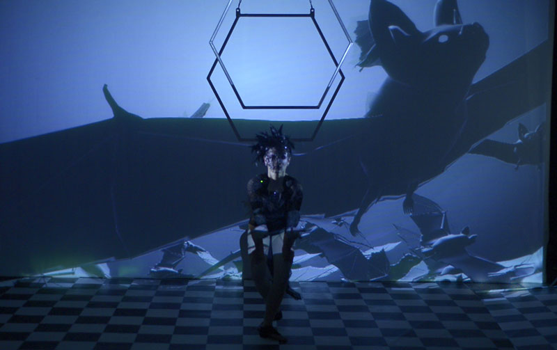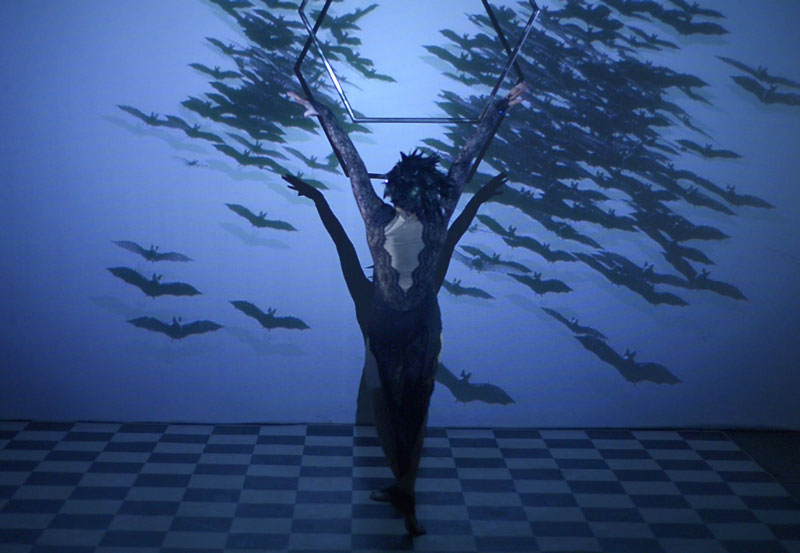 Dressed with a sophisticated black lace dress with emerald crystals and an elaborated feather mask, our aerial hexagon dancer starts her mesmerising choreography with a ground routine that introduces audience to her captivating story. Fully dressed in black just like a bat, she will command a flock of hundred of these flying creatures to dance and fly with her in the air.