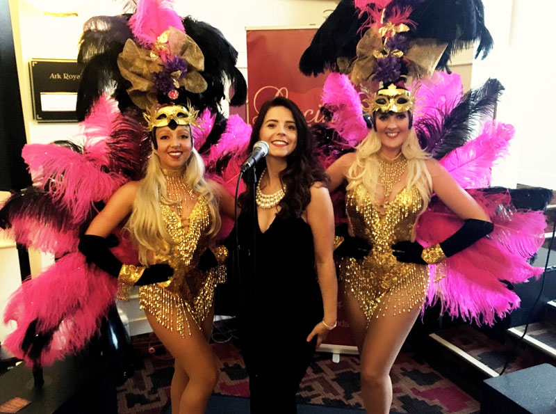 Our female vocalist can be booked to perform alongside a male singer and dancers for live stage shows and themed performances.