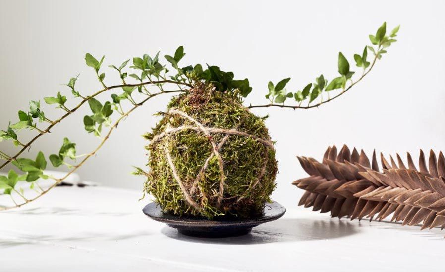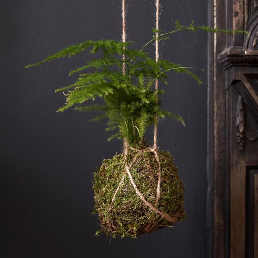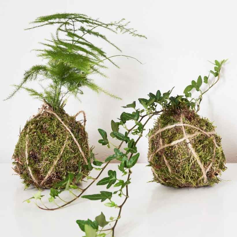 Known as kokedama, this gardening technique involves freeing a plant from its container and adding it to a moss-covered ball of soil