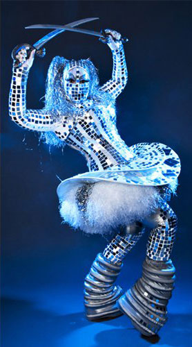 Mirra Bella the human mirror ball will dance her way around your event quite literally dazzling guests with a costume made out of thousands of mirror tiles. Accompanied by her very own light sources High Beam and Black Beam she will illuminate your event!
