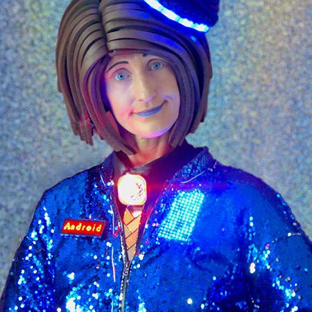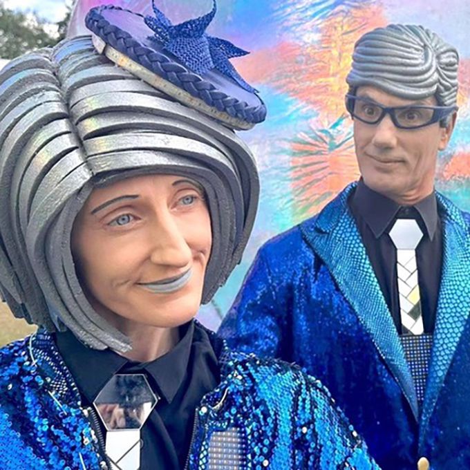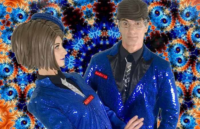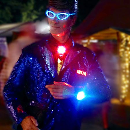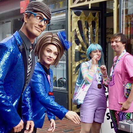 Wearing glittery jackets, rubber wigs, futuristic glasses and 4" platform shoes these fun walkabout characters are sure to draw guests attention