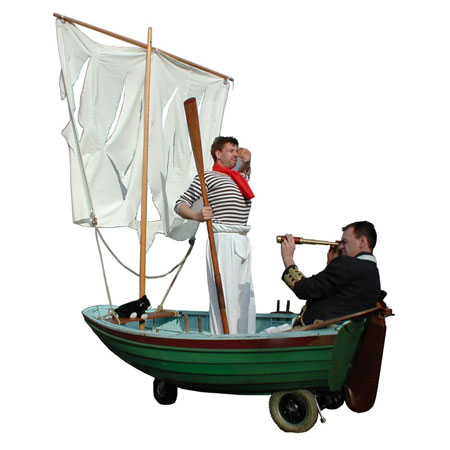 A walkabout lifeboat that is based on an 8ft clinker-built skiff and carries two hilarious and eccentric characters into your event. The Shipwrecked Captain and Boatswain’s Mate have been adrift since 1786 and are more than a little confused by their new found surroundings.