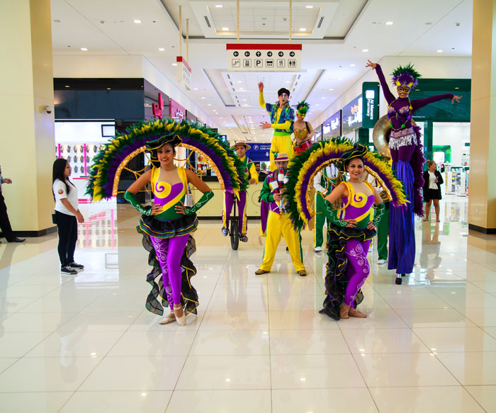 The walkabout musical parade offer and vibrant and fun variety show that is highly suited to shopping malls, festivals, street parades, private functions, family shows and South American themed events. They are based in Dubai but able to take their vibrant carnival parade to any event anywhere in the world.