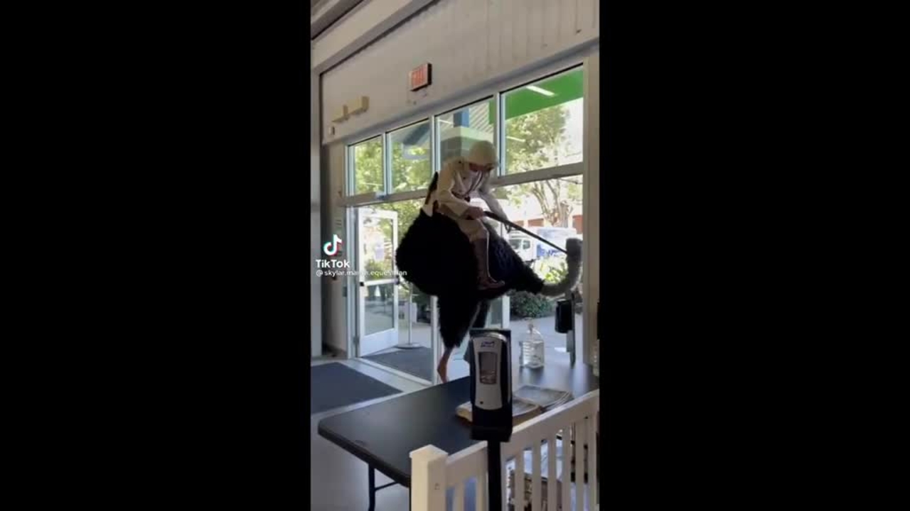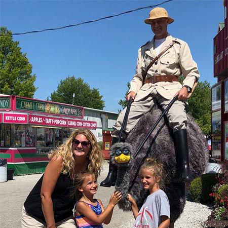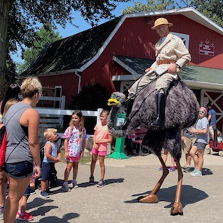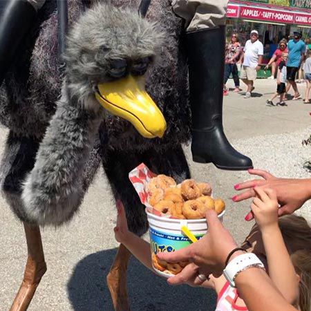 Our ostrich and rider engage and interact with the public, collecting pats on the head, sneaking kisses, stealing snacks and posing for photos