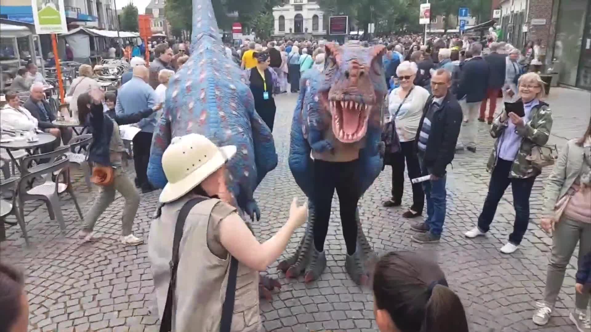 These roaming T-Rex dinosaurs grab attention with their striking appearance and fierce roars, only to surprise with their friendly, playful nature