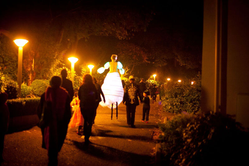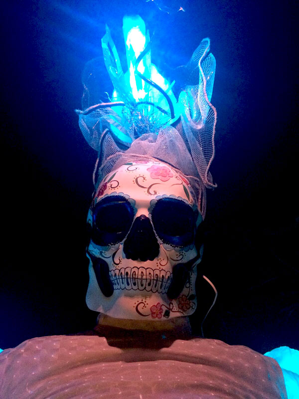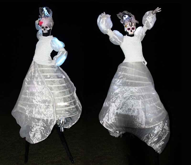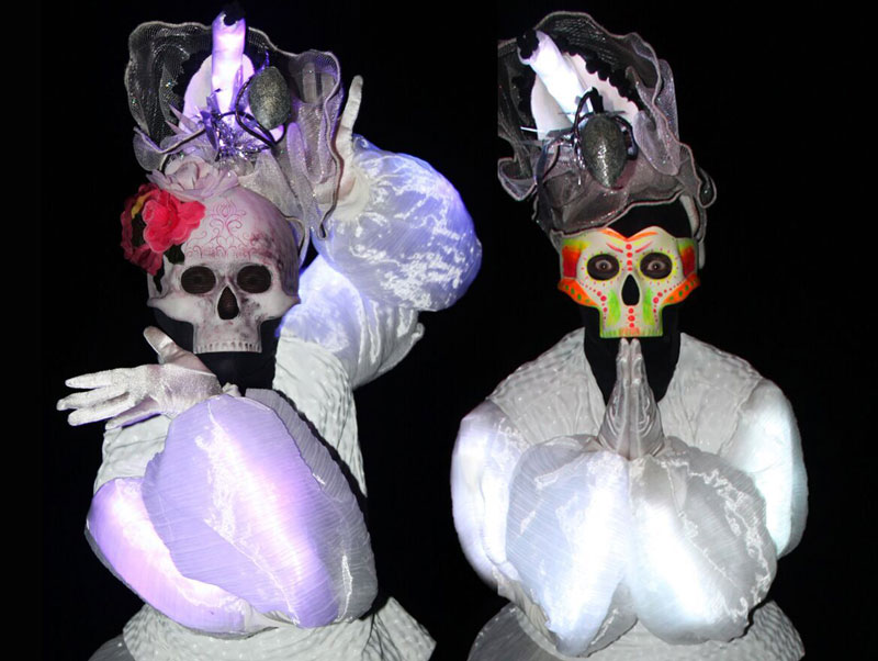 Our themed stilt walkers wear stunning LED costumes and hats with typical sugar skulls, traditional masks from Mexico. Their ethereal dresses and colourful masks especially stand out on dark nights or venues with dim light conditions.