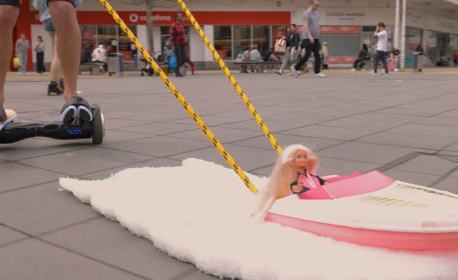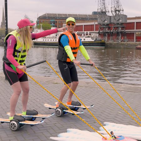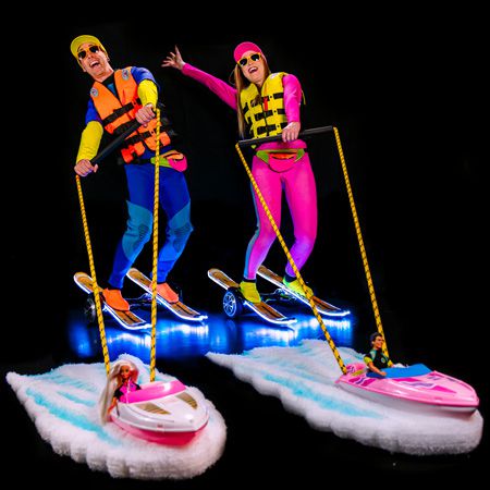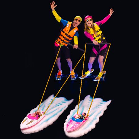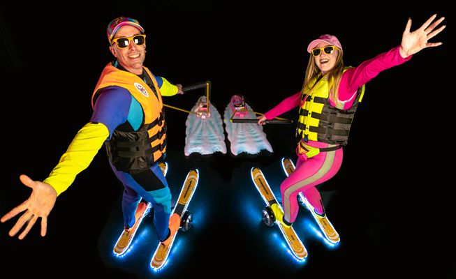 These waterskiers don’t need water to entertain as they glide effortlessly through your venue on skis and hoverboards, towed by mini boats