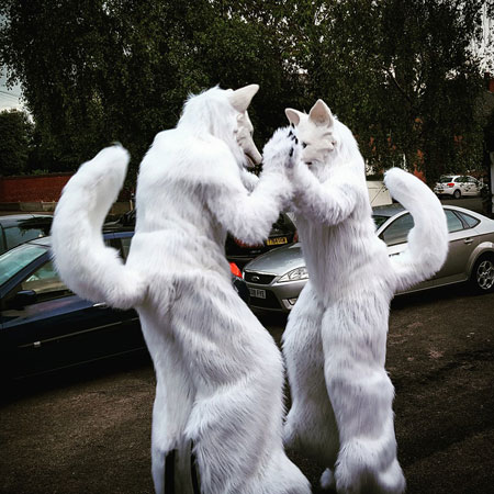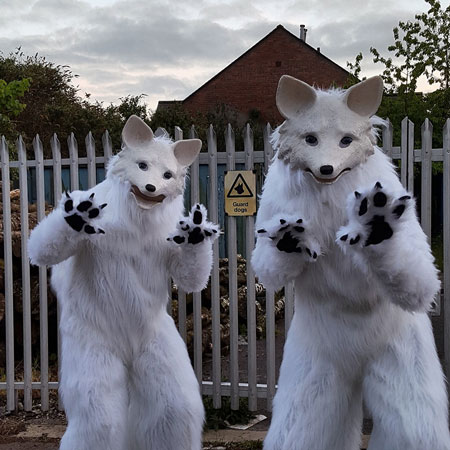 Based on a Japanese folk myth, legend has it that these white fox costume characters are the supernatural embodiment of lightening. Having unintentionally found themselves under the ward of a hapless dog handler, our naughty walkaround animals may occasionally obey their “owner’s” command but equally enjoy making fun of him whilst doing exactly as they please. Suitable for audiences of all ages, our foxes may be cute and cuddly but they also have a wicked sense of humour.