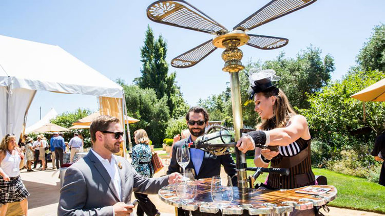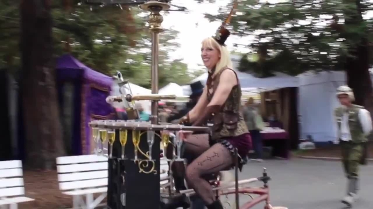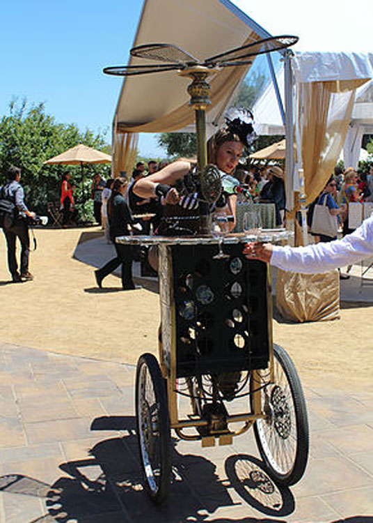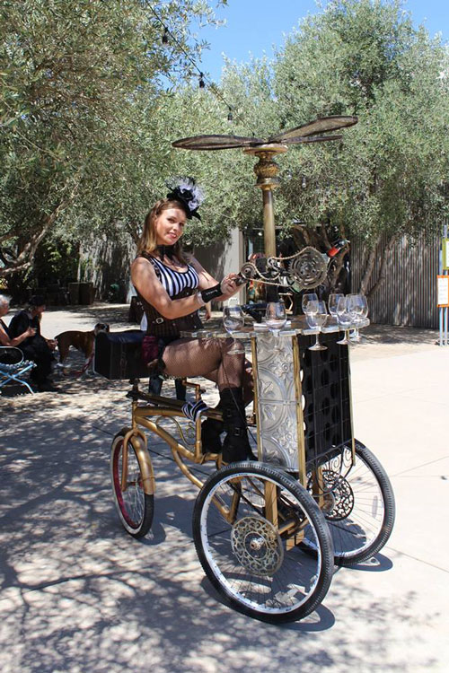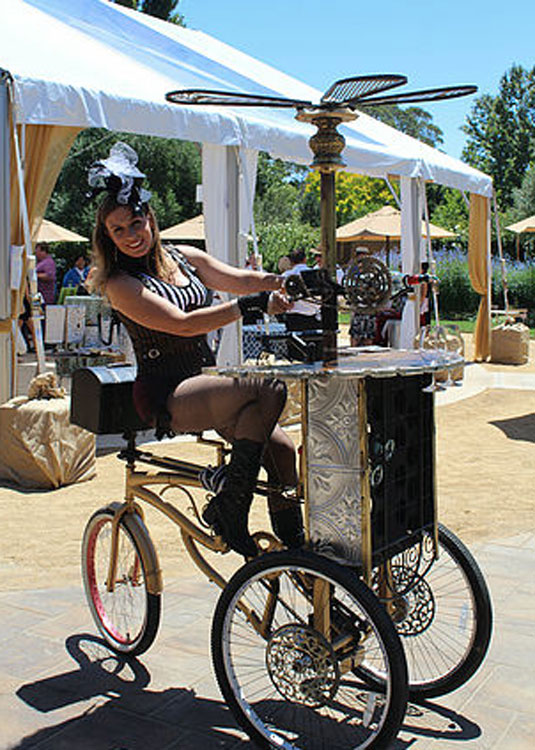The wine bike consists of an artistic mechanical design complete with matching costume and rotating fan blades to power this old school looking bike around to every thirsty guest in sight.