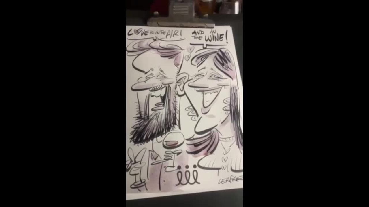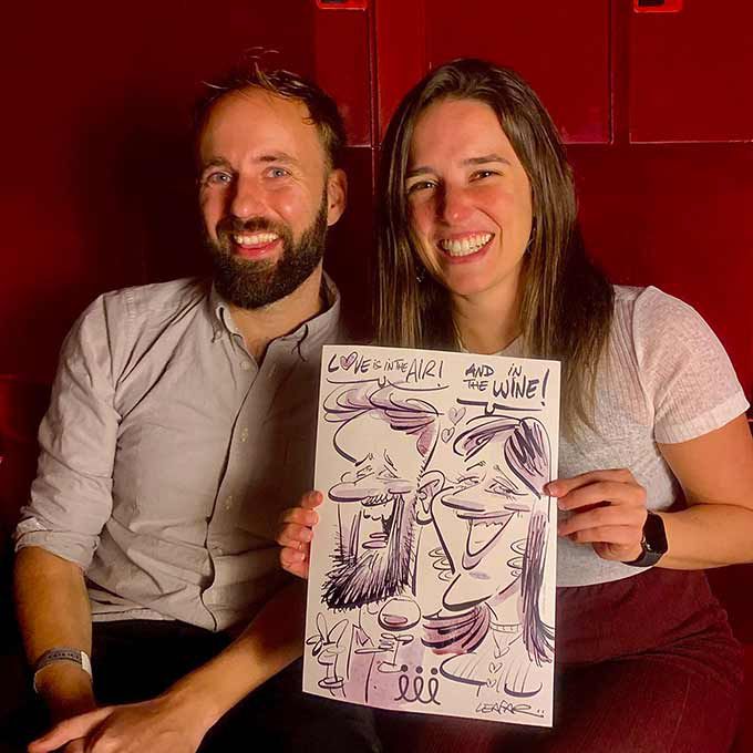 Our live caricaturist draws with red wine to create unique souvenirs for your guests to take away as a memento of your event