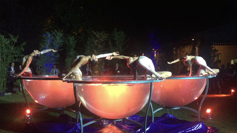 Disponibile in diverse formazioni, questo gruppo della water bowl offre spettacoli solisti, in coppia e di gruppo, come puoi vedere nelle immagini sopra. Eseguendo bellissime contorsioni e acrobazie, i nostri artisti intrecciano i loro corpi in modo tale che sembrino uno solo. Perfettamente sincronizzati, i nostri duetti e quartetti offrono uno spettacolo che è una vera delizia per gli occhi.