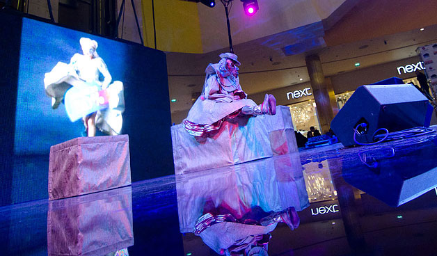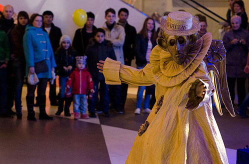 Gli attori utilizzano lo spazio a disposizione per improvvisare situazioni e scenari. Utilizzano una varietà di strani oggetti dorati come un pesce dorato su ruote, un libro di gesti e una palla in movimento. Si tratta di un intrattenimento interattivo che non solo affascina la folla durante la performance, ma coinvolge anche i membri del pubblico.