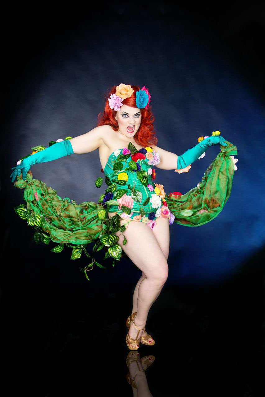 Porta umorismo, una sensazione di regina del dramma un po' drag e un grande scintillio di glamour al burlesque classico, mescolando la sua danza con un tocco di stile neo burlesque.