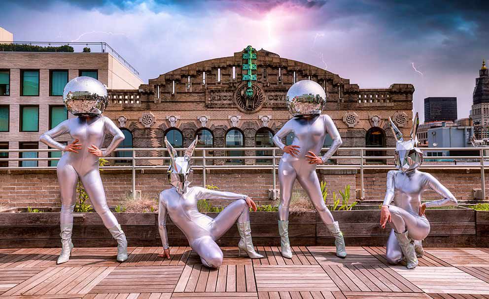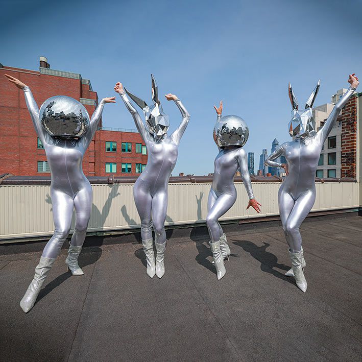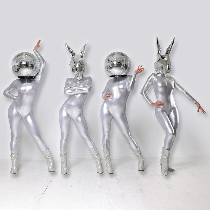 Prenota questi costumi con le teste a palla da discoteca e conigli specchiati d'argento per momenti Instagrammabili che i tuoi ospiti ameranno condividere sui loro social media.