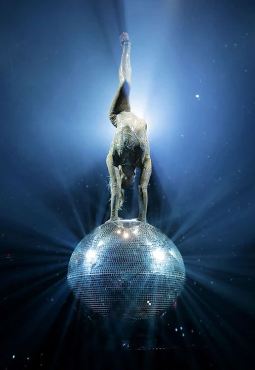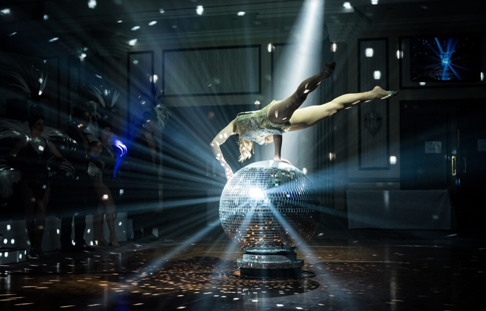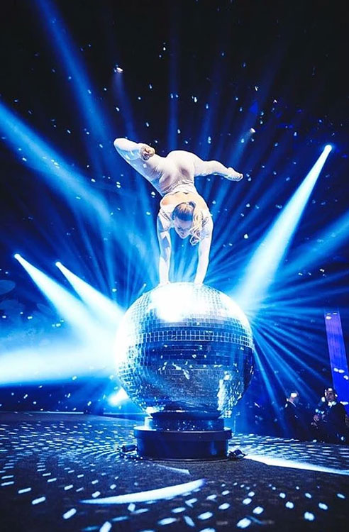 Con una combinazione di equilibrio, contorsionismo e acrobazie, la nostra contorsionista sulla palla da discoteca può creare performance completamente personalizzate per adattarsi perfettamente al tuo evento.