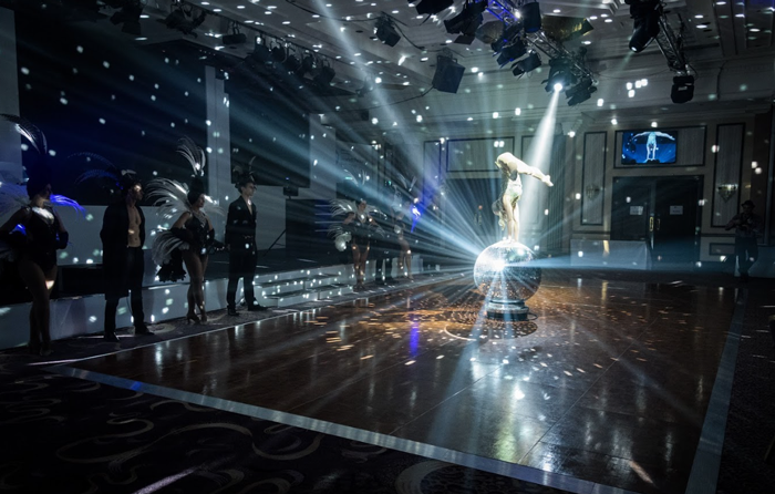Un numero di contorsionismo unico, ricco di movimenti audaci, fascino e luccichio, riflette la luce per riempire l'intera stanza creando uno spettacolo straordinario che ferma il pubblico.