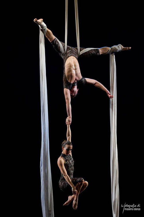 Intrecciando la loro diversa gamma di abilità in una performance sorprendente, il nostro duetto con le sete crea uno spettacolo ricco di acrobazie che si susseguono con eleganti movimenti di danza e incredibili posizioni.
