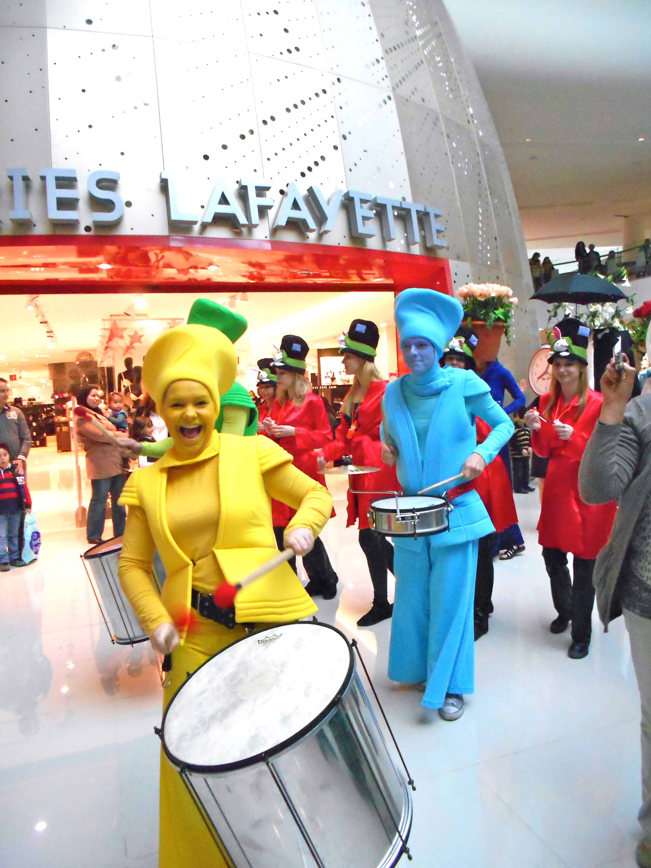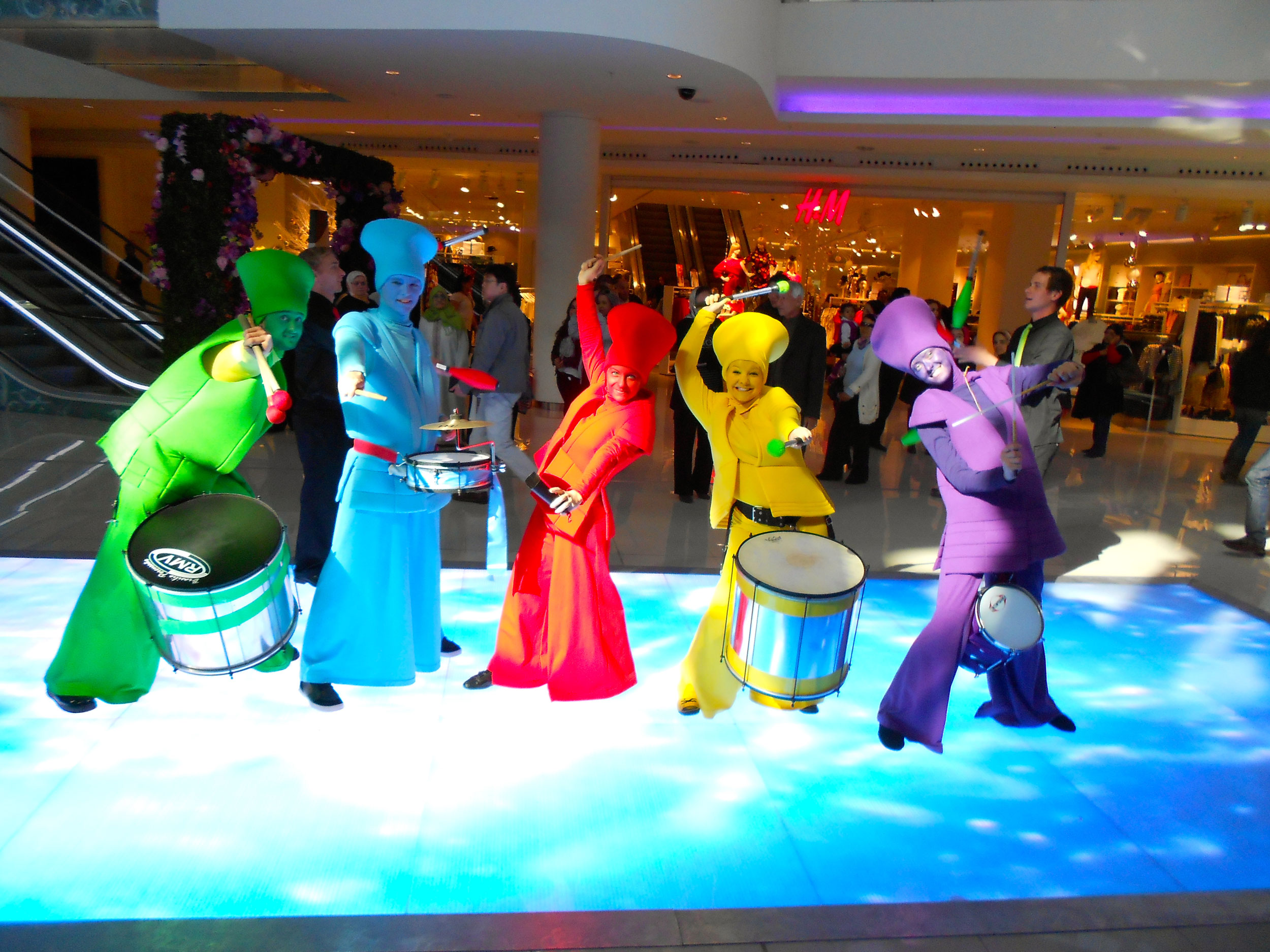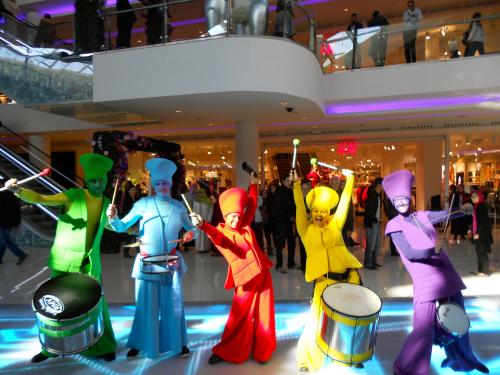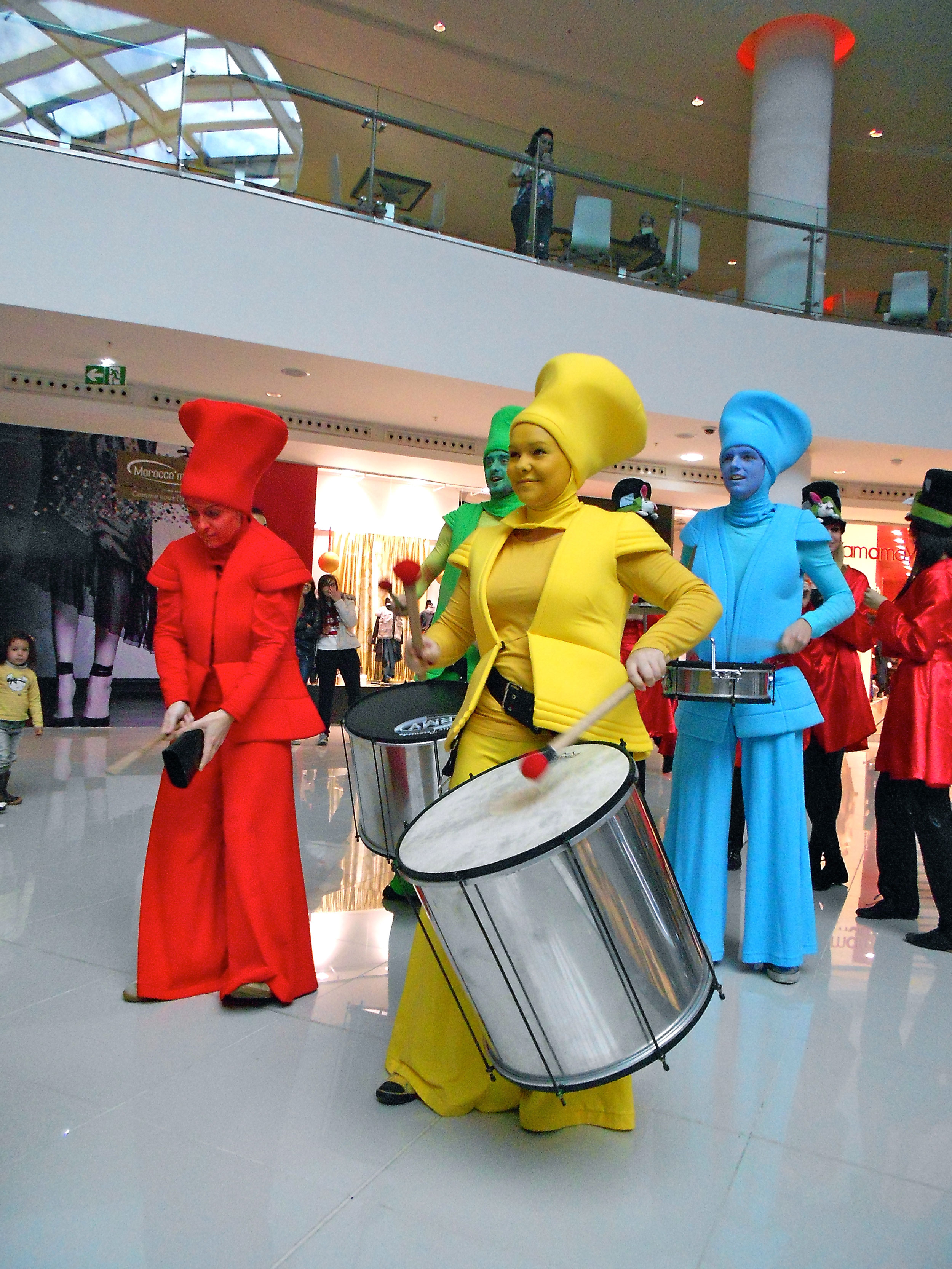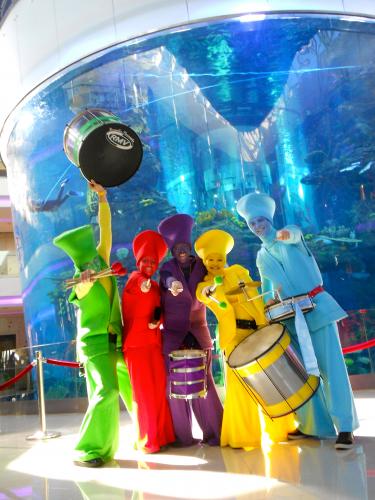 Vestiti con bellissimi costumi vibranti, portano un tocco di rosso, giallo, verde, blu e viola. Accattivanti e totalmente unici, cattureranno l'attenzione del pubblico e daranno energia agli spazi degli eventi, grandi e piccoli. I loro spettacoli coreografati di percussioni presentano una miscela di canzoni divertenti che creano un'atmosfera festosa e celebrativa che farà ballare gli ospiti e i passanti e li farà unire al divertimento.