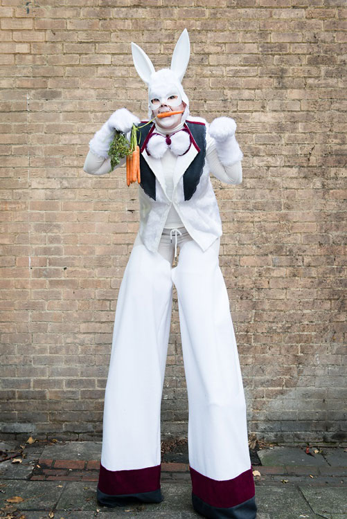 I nostri artisti in giro sono disponibili sia come conigli bianchi camminatori su trampoli che come personaggi di conigli bianchi in giro, senza trampoli!
