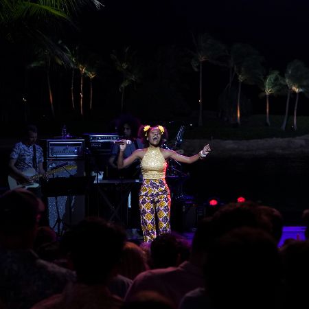 Può essere prenotata come solista o con la sua impressionante band di musicisti, composta da chitarra, basso, batteria e tastiere, per un'esperienza completamente dal vivo.