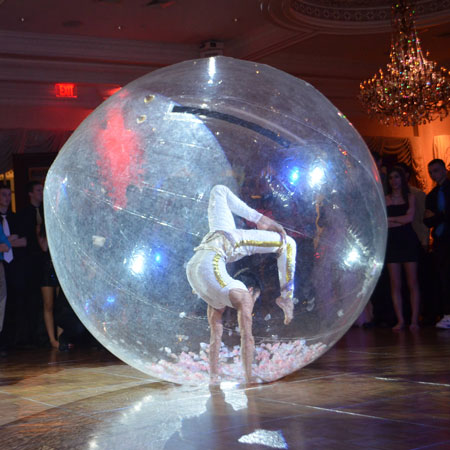 Questi acrobati e ginnasti zorbing possono esibirsi da soli o in coppia per creare uno spettacolo più vario e dinamico da ammirare. I nostri contorsionisti delle bolle non solo possono personalizzare il loro spettacolo con l'uso di accessori come le piume, ma possono anche aggiungere luci LED per creare una performance visivamente stupefacente che ha un impatto notevole. Inoltre, oltre ad aggiungere elementi aggiuntivi come la neve finta alla loro performance, questo spettacolo è perfetto per l'intrattenimento in un paesaggio invernale, poiché le bolle sembrano globi di neve, creando un elemento intricato e visivamente stupefacente da aggiungere al tuo evento natalizio o a tema invernale.