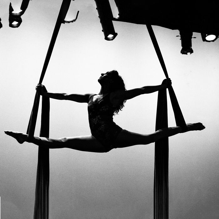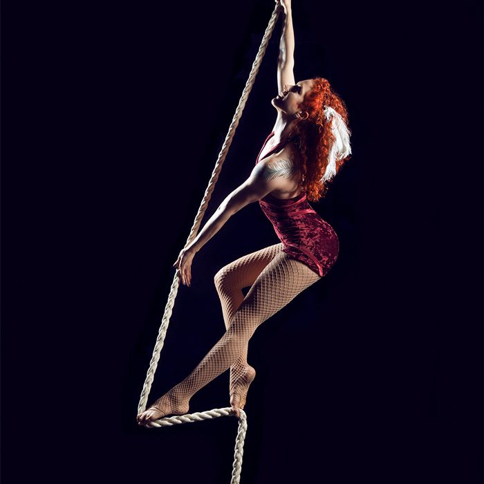 Un acrobata esperta che si specializza in apparati aerei verticali, tra cui tessuti, corda, cinghie e amaca