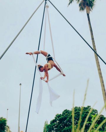Oltre alla sua profonda passione per i tessuti aerei, la nostra artista aerea offre anche esibizioni di cerchio aereo, corda, palo, duo aereo e ambientale.