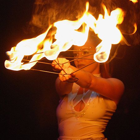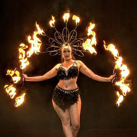 Utilizzando una varietà di attrezzi e tecniche, tra cui ventagli di fuoco, mangia fuoco e altro ancora, la nostra artista del fuoco offre sempre uno spettacolo dinamico.