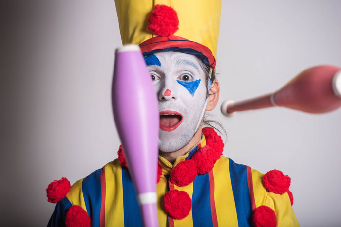 Inoltre, per attirare i membri del pubblico che seguono questo circo ambulante, ci sono due clown su trampoli, uno su trampoli elastici e un altro che fa giocoleria, gira il poi e crea modelli di palloncini per i passanti. Nessun carnevale itinerante sarebbe completo senza un clown eccentrico, e il nostro non deluderà.