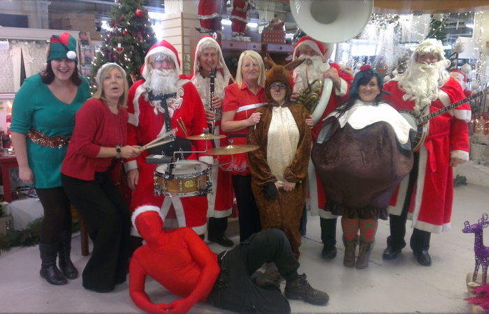 Questa band natalizia in costume da Babbo Natale è la migliore band itinerante e di intrattenimento per fare festa intorno all'albero di Natale.