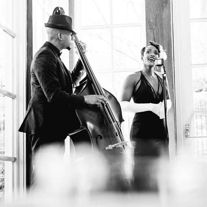Ideali per eventi in cui lo spazio è limitato o in cui una formazione più grande o un DJ sarebbero troppo impegnativi, la nostra cantante e il nostro bassista offrono un intrattenimento elegante per matrimoni durante il ricevimento e il pranzo di nozze, e come intrattenimento aziendale per un evento di networking a base di cocktail o una cena sofisticata.