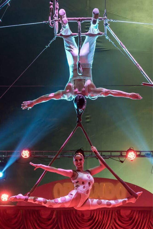 Questa coppia versatile può anche esibirsi in spettacoli aerei unici con diversi attrezzi come le sete.